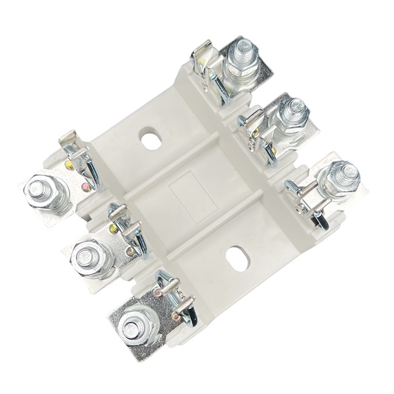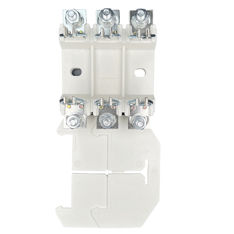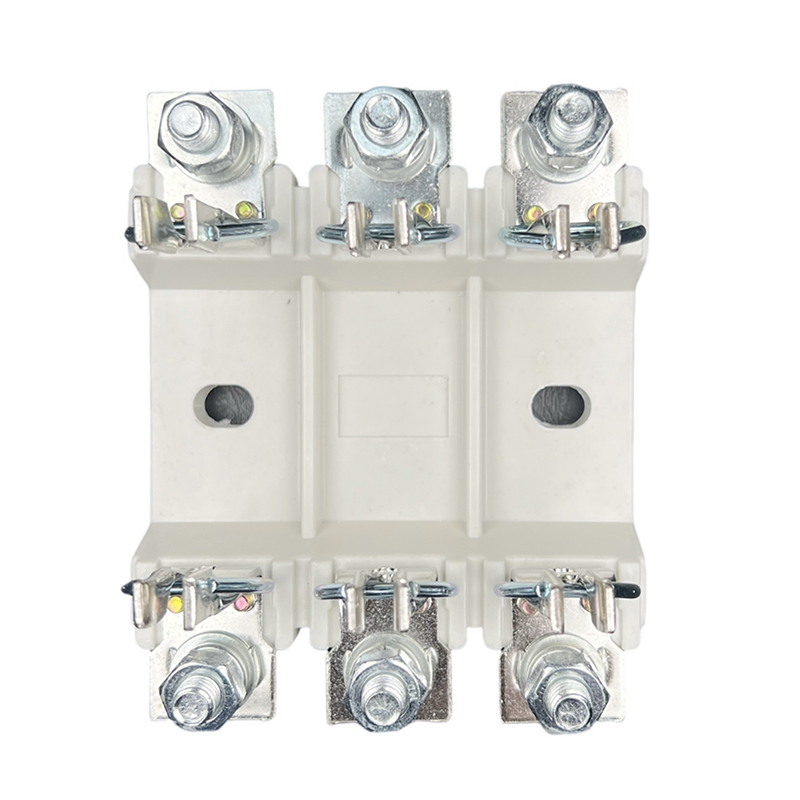 The base is a fixed part of the fuse, which supports the electrical connection between the fuse and the access circuit. It is composed of an insulating base plate, a wedge-shaped static contact, a retaining spring, etc., and is an open structure. The front terminal is connected to the external wire by bolts. Two mounting holes are reserved on the bottom plate for fixing. The whole base has the advantages of good heat dissipation, high tensile strength, reliable contact and convenient operation.